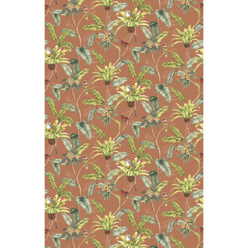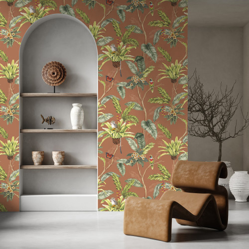 Ce dessin d’Axelle Duveau, pattern textile designer, fait de fines ondulations, évoque les forêts couloirs riches en lianes, ainsi que la mangrove, où vit le Saïmiri commun, appelé également singe-écureuil. Déclinée en 3 coloris, « Fugue tropicale » prétextera une ambiance jungle tout en légèreté, telles les plantes à la tige particulièrement souple de cette illustration.