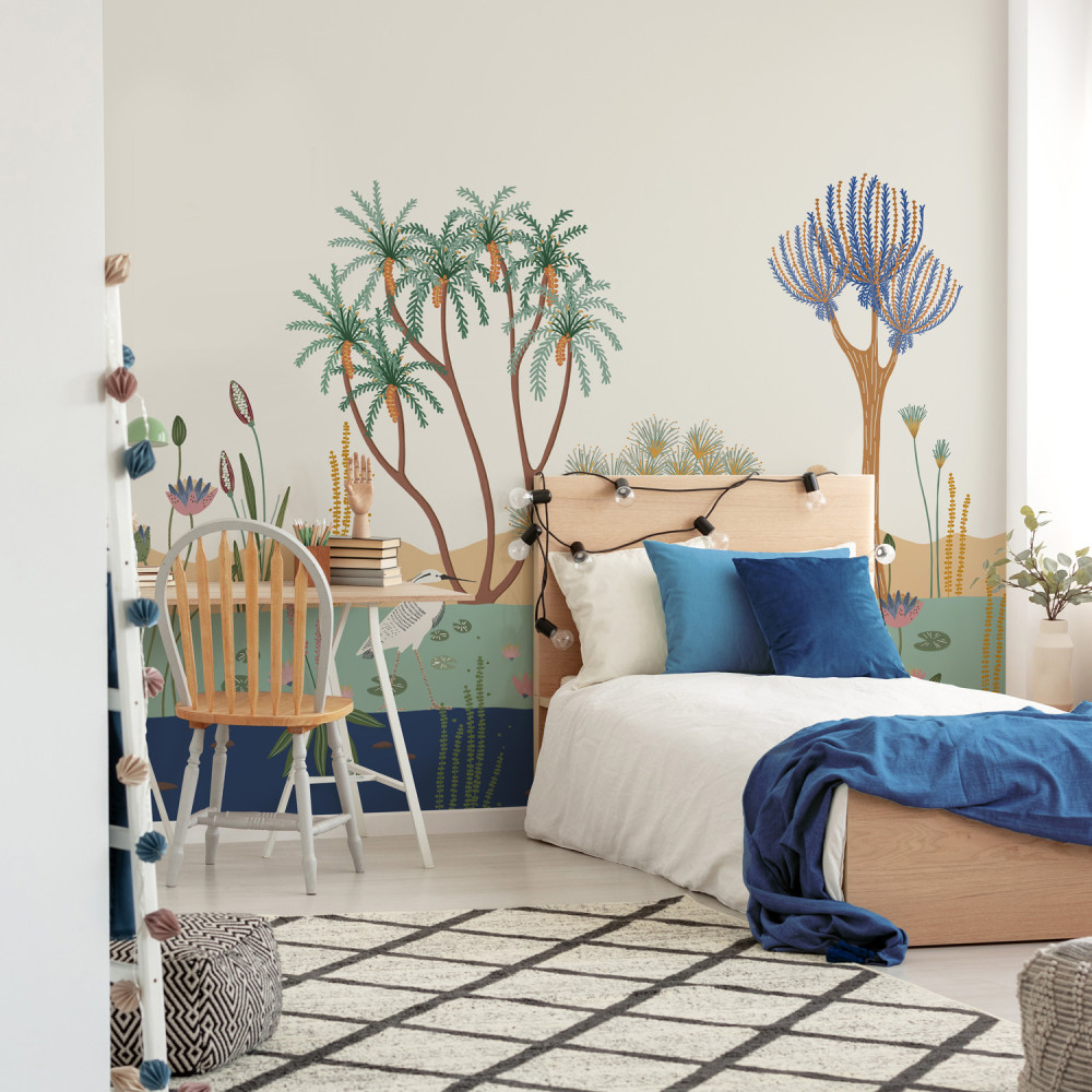 Cette fresque murale haut de gamme, illustrée par Zoé Jiquel, nous transporte sur les rives du Nil. Elle a su saisir le contraste entre la vallée du Nil, verdoyante et fertile, via une palmeraie haute en couleurs, et les montagnes arides qui la bordent. Un décor qui transmet à la fois l’histoire et l’émotion. Des couleurs au service d’une atmosphère enchanteresse pour égayer votre intérieur et s’évader vers des contrées exotiques. Vivez l'expérience d'un voyage à fleur d’eau au rythme du fleuve...