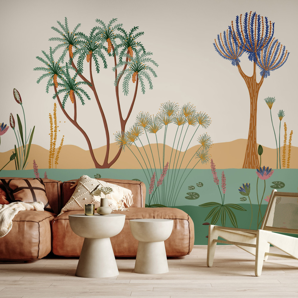 Cette fresque murale haut de gamme, illustrée par Zoé Jiquel, nous transporte sur les rives du Nil. Elle a su saisir le contraste entre la vallée du Nil, verdoyante et fertile, via une palmeraie haute en couleurs, et les montagnes arides qui la bordent. Un décor qui transmet à la fois l’histoire et l’émotion. Des couleurs au service d’une atmosphère enchanteresse pour égayer votre intérieur et s’évader vers des contrées exotiques. Vivez l'expérience d'un voyage à fleur d’eau au rythme du fleuve...